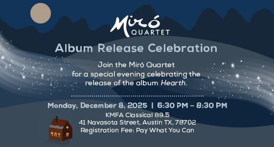 This album celebrates the holidays as a time of connection, memory, and hope. Be among the first to experience selections from Hearth, hear stories from the artists, and share an evening of fellowship and inspiration with the Miró Quartet and fellow classical music lovers.