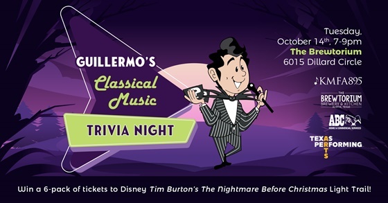 Texas Performing Arts is teaming up with us this month to present Guillermo’s Nightmare Before Classical Trivia Night! We're celebrating the launch of our new Disney Tim Burton’s The Nightmare Before Christmas Light Trail at the Lady Bird Johnson Wildflower Center with a haunted evening of classical chaos.