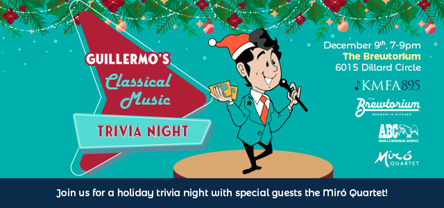 Classical music savants and those who could use a book called "Classical Music for Dummies," KMFA Classical 89.5 invites you to The Brewtorium Brewery and Kitchen for Austin's best Trivia Night hosted by our beloved Manager of Education and Outreach (and weekend host) Guillermo Delgado! That's right, it's Guillermo's Classical Music Trivia Night! presented by ABC Home & Commercial Services.